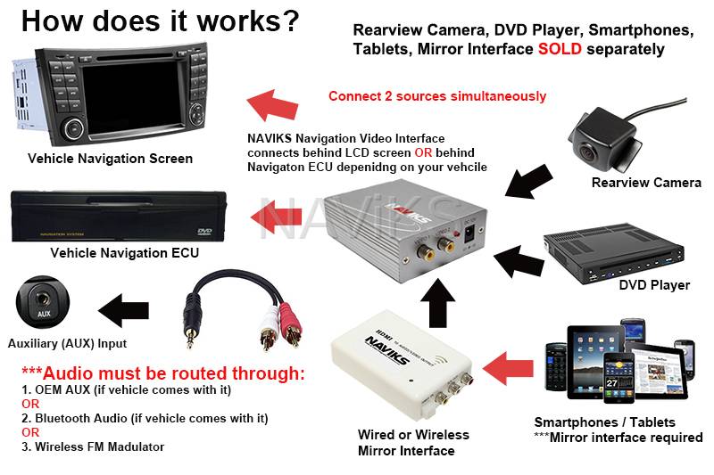 Audio from the video source must be routed to the vehicle's OEM 3.5 mm AUX Audio input. If the vehicle doesn't come with a 3.5 mm AUX audio input you must seek a 3.5mm AUX audio add-on that integrates with the factory radio OR use an FM modulator.