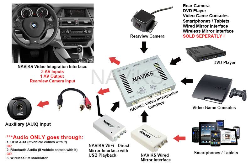 - Audio from your video sources must be routed to the vehicles OEM Audio AUX input. If your vehicle doesn't come with Audio AUX input you must seek a Audio AUX add-on to the factory radio OR use an FM modulator.