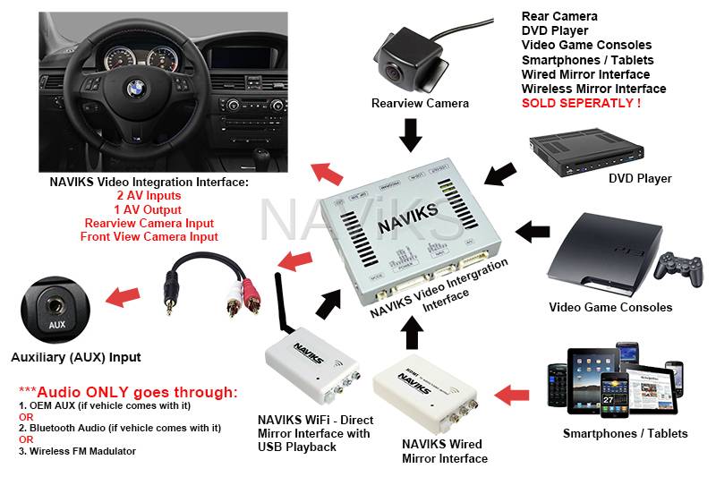 - Audio from the video source must be routed to the vehicle's OEM Audio AUX input. If the vehicle doesn't come with Audio AUX input you must seek for an Audio AUX add-on that integrates with the factory radio OR use an FM modulator.